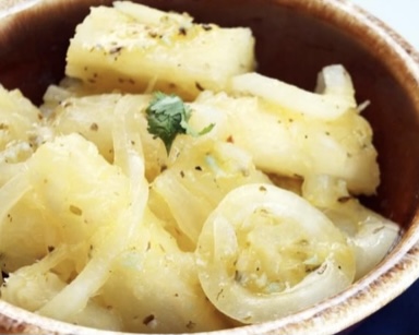 Manioca bollita e saltata in padella con cipolla rossa, pomodorini e limone